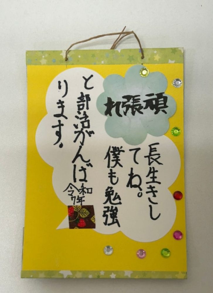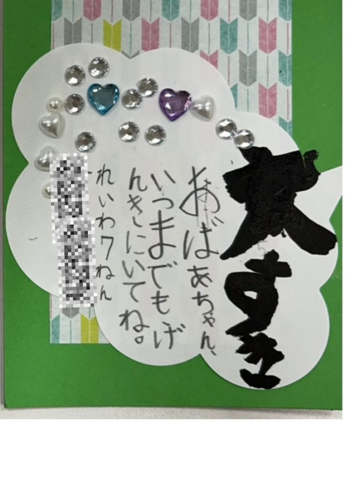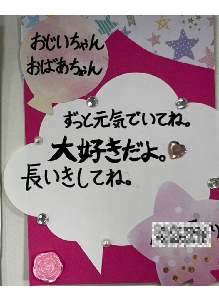 わたくしの作った台紙に、デコレーションや工夫を凝らし生き生きとした個性的なもの、メッセージが伝わりほのぼのして良い作品が出来たと思います。