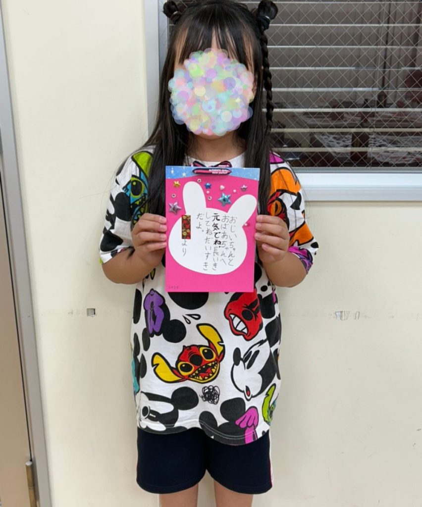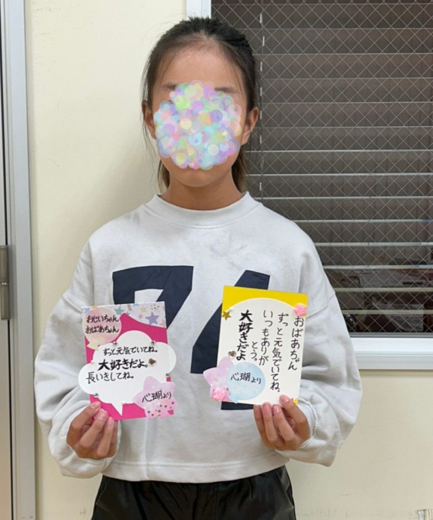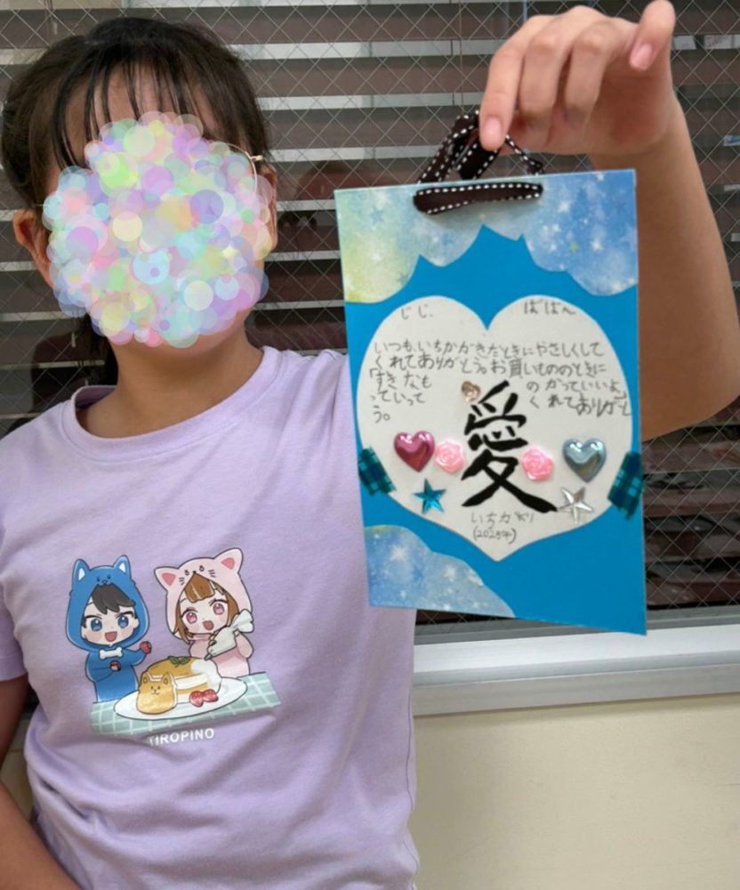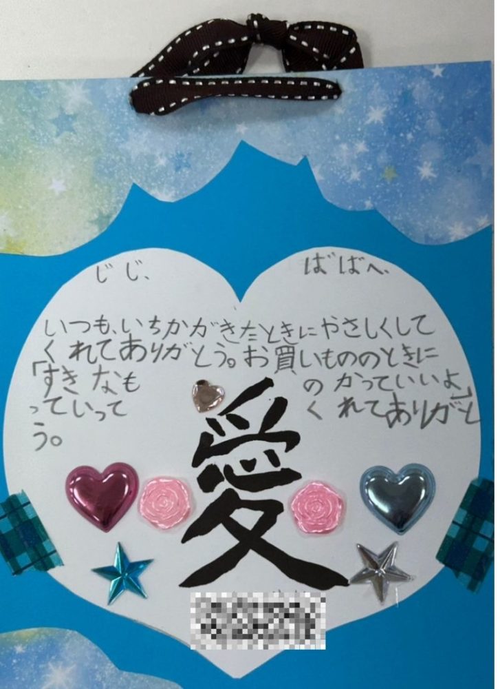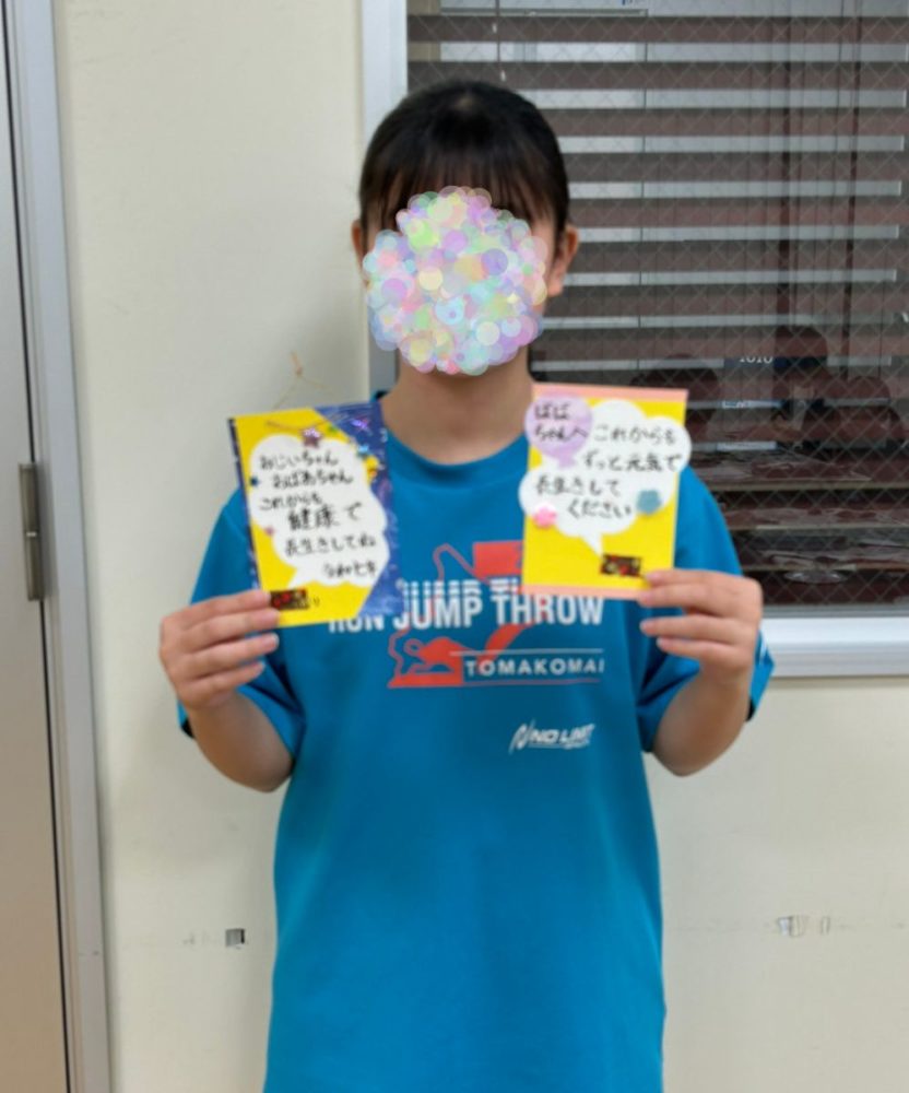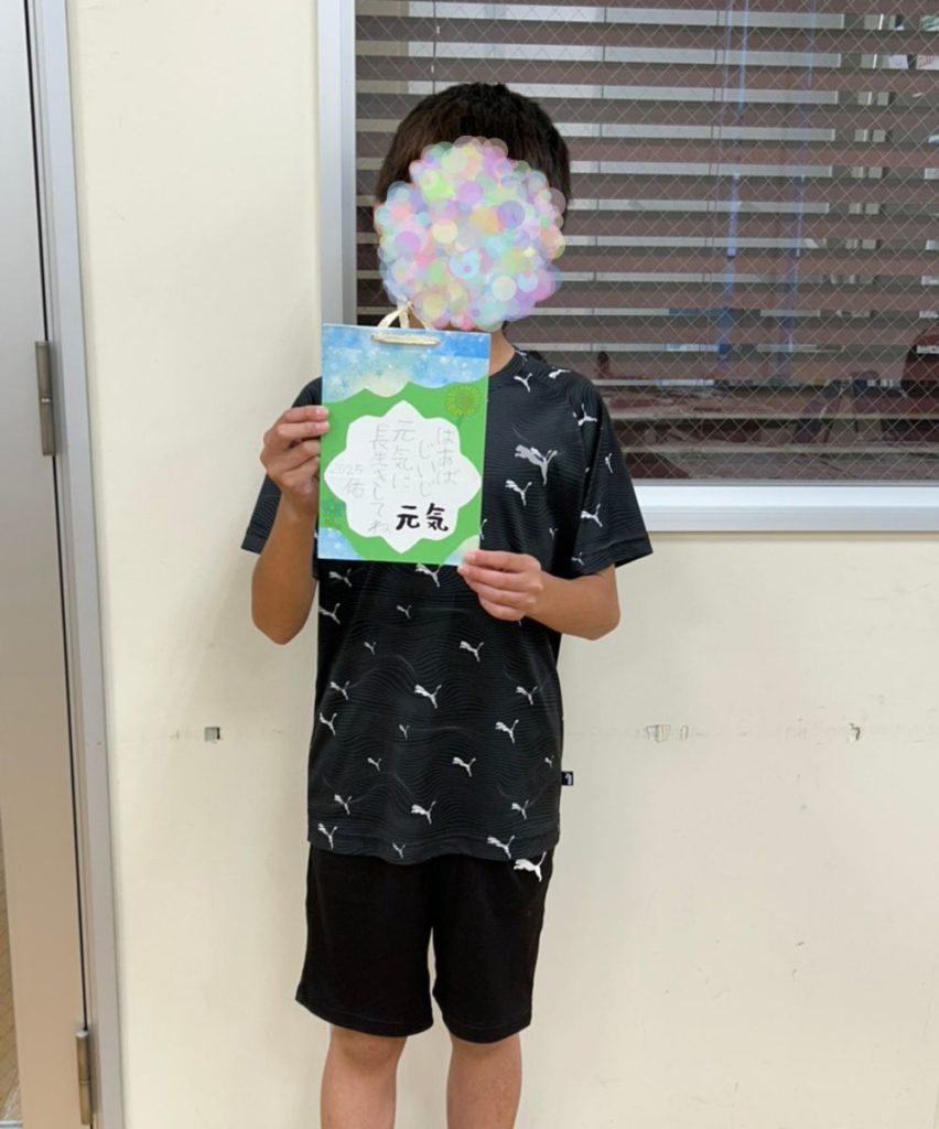 今回の敬老カードは、暑中見舞い作成と重なり、時間の関係でわたくしが台紙を作成したものを使用してもらいましたが、自身で台紙から作成した学童さんもおりました。